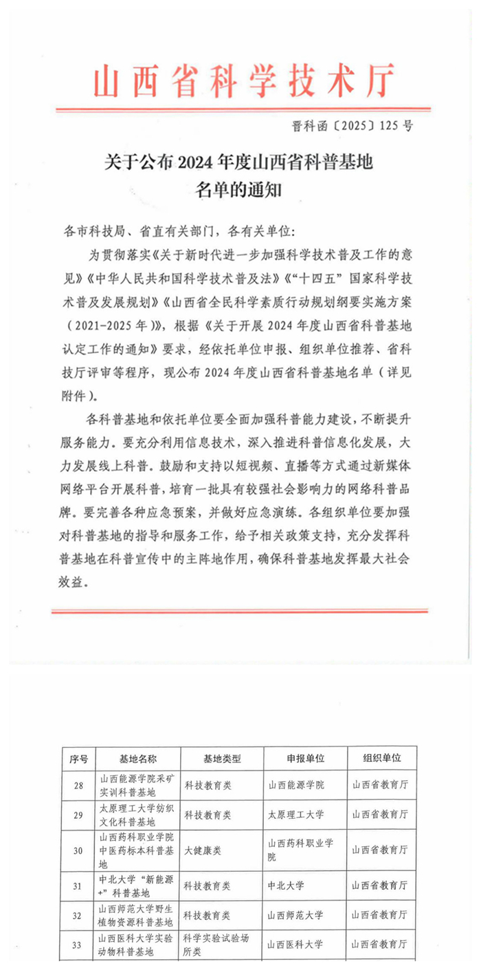 近日,山西省科技厅公布2024年省级科普基地名单,304am永利集团官网纺织文化科普基地成功获批教育科研类科普基地,标志着我省纺织服装科普工作迈上新台阶。