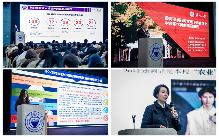 开幕式后,四场专题讲座依次展开,内容精彩纷呈。天津工业大学刘雍教授以《纺织类专业人才培养的现状、思考与探索》为题,分享了在纺织教育领域的深入见解;河北科技大学侯东昱教授围绕《“数”造新裳,“智”链未来》,通过实际案例生动展示了数字技术在服装行业的创新应用;苏州大学吴磊教授以《美育浸润下音乐学科建设路径》为题,探讨了美育背景下音乐学科的发展方向;华南农业大学郝丽教授则聚焦《粤港澳大湾区时尚演艺教育生态》,分享了表演专业在区域背景下的创新实践经验。